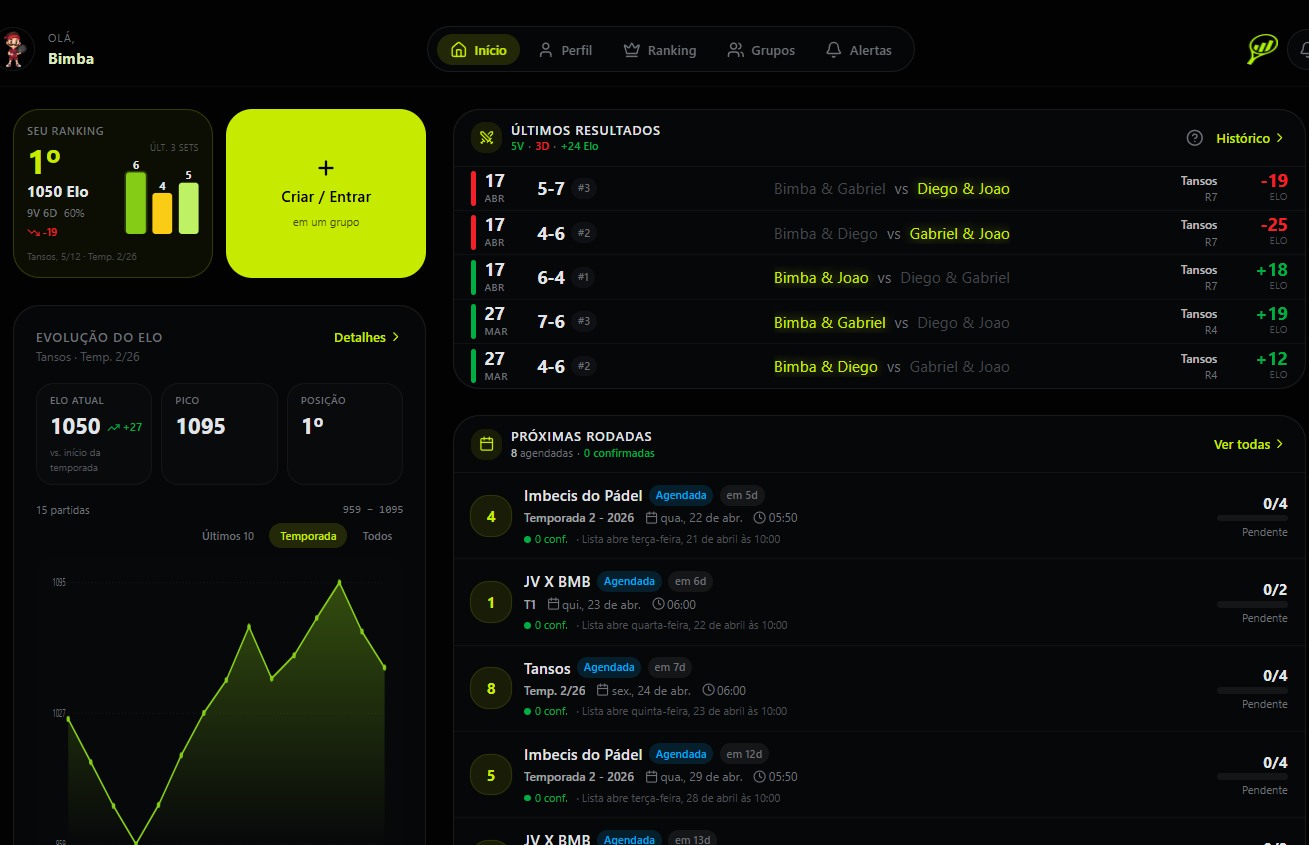 O RankMyMatch transforma a sua roda de padel em uma liga profissional: ranking Elo de verdade, agenda automática, sorteio de duplas, histórico completo e estatísticas que mostram quem realmente joga.